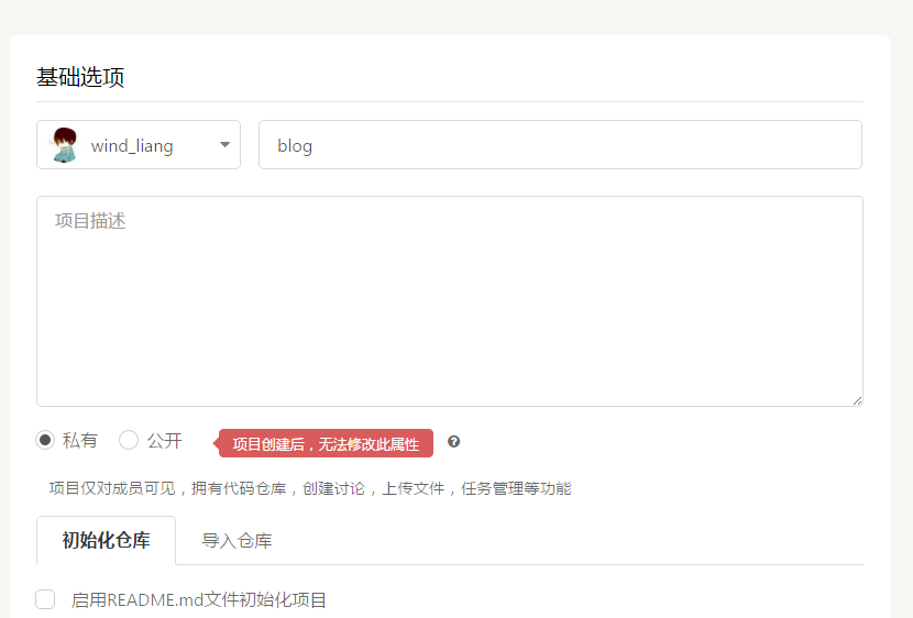 输入名称blog,其他不用改,点击创建项目即可。:git,coding,购买域名相关/c2.png)