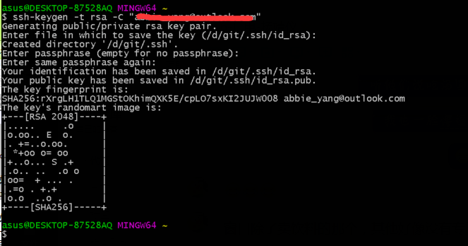 双引号里的邮箱改成你自己的邮箱,然后一路回车,会出现一张萌萌哒图:git,coding,购买域名相关/c4.png)