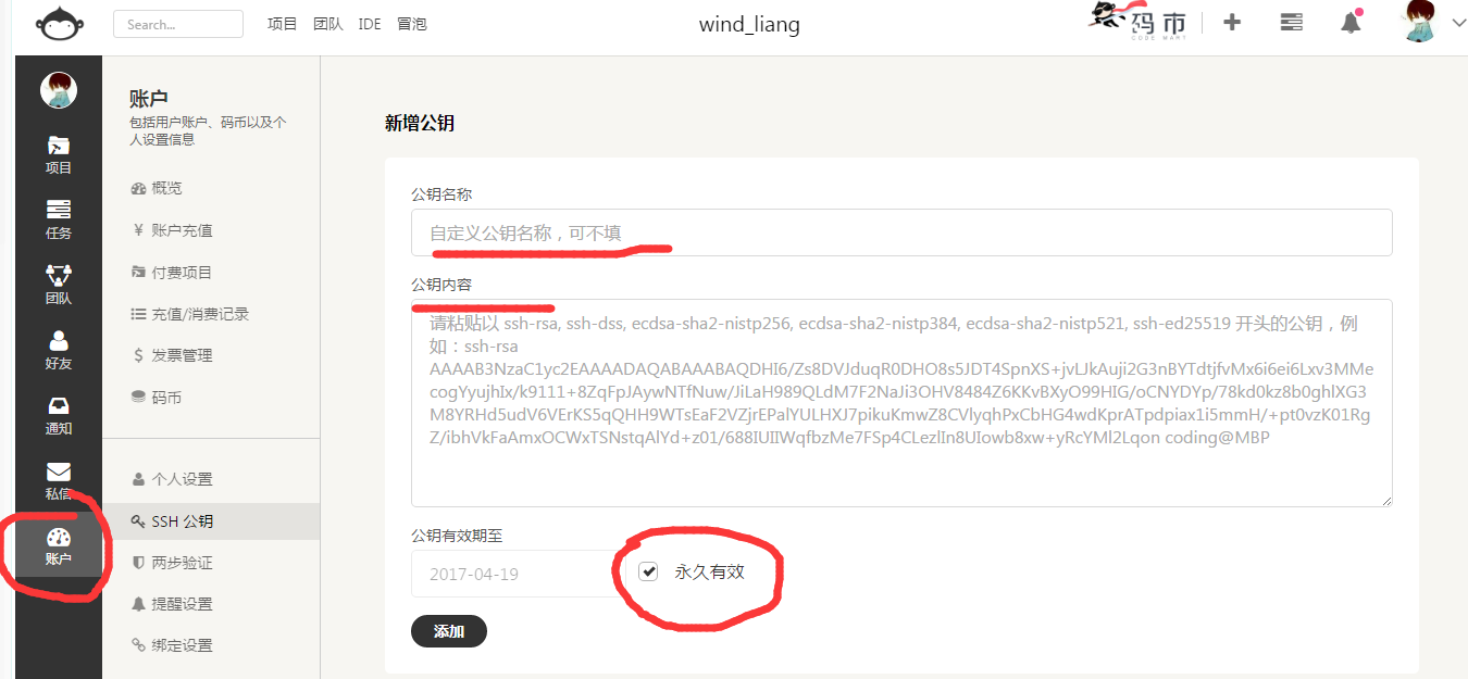3.打开Coding,点击账户,SSH公钥,将刚才复制的内容加到公钥内容中,名称自己写。:git,coding,购买域名相关/c6.png)