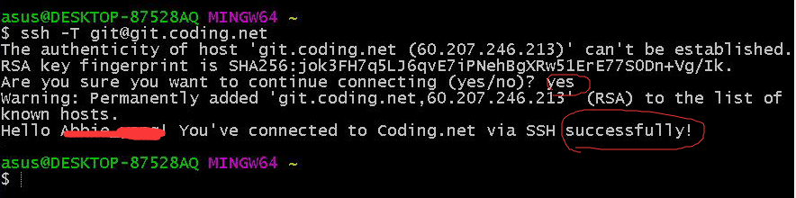 4.打开gitbash,输入命令 ssh -T git@git.coding.net,中间需要输入yes,然后出现successfully即代表配置成功。:git,coding,购买域名相关/c7.png)