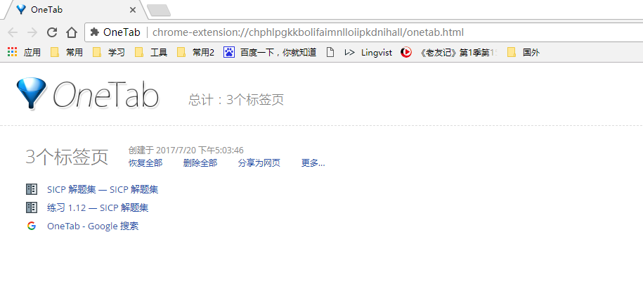 Chrome 的一个插件,当你打开了很多标签页,然而你要睡觉了,点一下 OneTab,第二起来打开 Chrome ,可以选择恢复这些标签页。