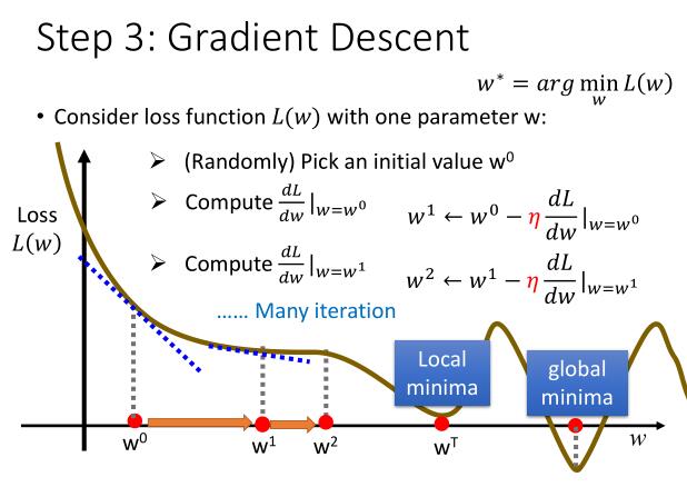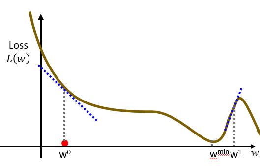 根据 $w_0$ 得到 $w_1$ ,再根据 $w_1$ 得到 $w_2$,一直迭代,直到使得 Loss 值最小,当然从图上就可以看到我们可能会到达一个 Local minima ,也就是局部最小,后边再讲这个问题。而线性回归不需要考虑这个问题,因为它如果有极小值,那么这个极小值一定是最小值。