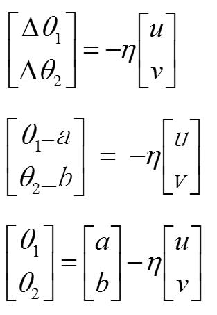 所以我们取 $(\Delta\theta_1 , \Delta\theta_2) $ 向量为 &(u,v)&向量的反向,构成 180° ,使得 $cos\theta$ 等于 -1 ,然后使得它的模最大,也就是 d (乘上 $\eta$ 即可),此时 L 由于是他俩的点积,所以 L 达到最小。即