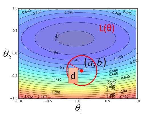 假设开始我们初始化 $ \theta_1 = a$ , $ \theta_2 = b$ ,然后以 d 为半径画一个很小很小的圆,以便满足泰勒级数中的那个约等于的式子(图上圆看着大,我们假设它很小)。然后我们在这个圆里寻找使得 Loss 值最小的 $\theta_1$ 和 $\theta_2$ 。得到新的$\theta_1$ 和 $\theta_2$ ,继续重复画一个圆,找使得圆内 Loss 值最小的 $\theta_1$ 和 $\theta_2$ ,然后一直迭代下去,慢慢的我们就会得到使得 loss 值全局最小的 $\theta_1$ 和 $\theta_2$ 了。