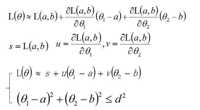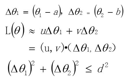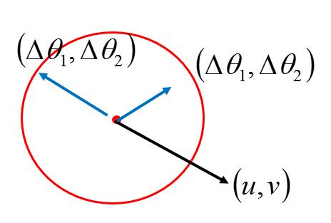我们把 L 看做是两个向量的点积,(u,v) 向量是一个固定的向量 ,我们把它的起点移动到圆心 的位置。而 $(\Delta\theta_1 , \Delta\theta_2) $ 向量是任意方向的,长度小于 d 的向量,为了方便计算,我们把它的起点也移动到圆心的位置。