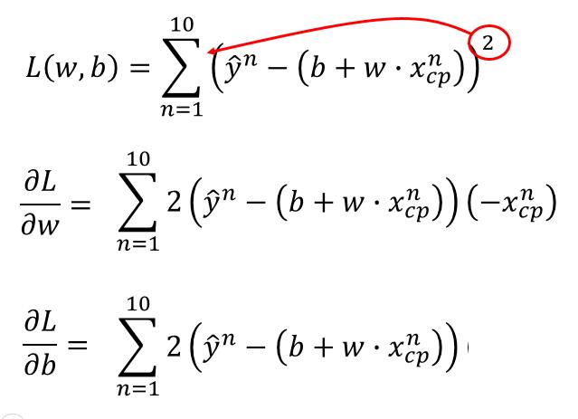 $$ L = \sum_{n=0}^{10} ( \hat{y}^n - ( b+ w · x{^n_{cp}} ) )^2$$