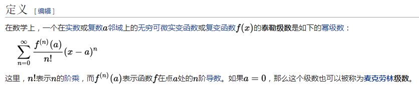 在数学中,泰勒级数(英语:Taylor series)用无限项连加式——级数来表示一个函数,这些相加的项由函数在某一点的导数求得。泰勒级数是以于1715年发表了泰勒公式的英国数学家布鲁克·泰勒(Sir Brook Taylor)来命名的。通过函数在自变量零点的导数求得的泰勒级数又叫做麦克劳林级数,以苏格兰数学家科林·麦克劳林的名字命名。 –维基百科