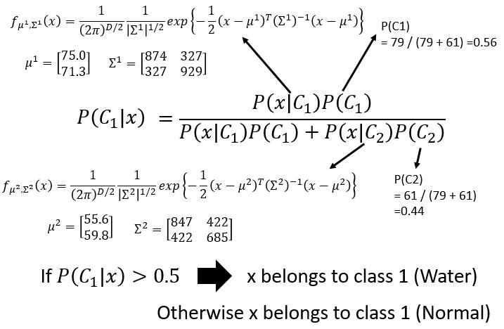 观察到公式 P(C1) 和 P(C2) 非常好算,无非是用属于 Class1(Water) 的个体数量处除以总数就是 P(C1),用属于 Class2(Normal) 的个体数量处除以总数就是 P(C2)。如下图: