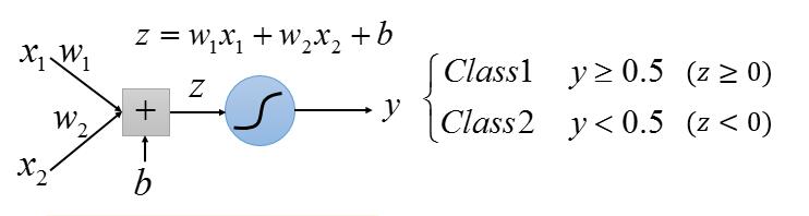 y ≥ 0.5 相当于 z ≥ 0 ; y < 0.5 相等于 z < 0 ; 而 z 相当于一条直线。所以 LR 的任务就是找一条直线,把两组数据分到直线的两侧。