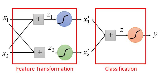 这样就改变了原始数据的分布,我们就可以找到一条直线分隔 class1 和 class2 ,从而实现我们的分类任务。